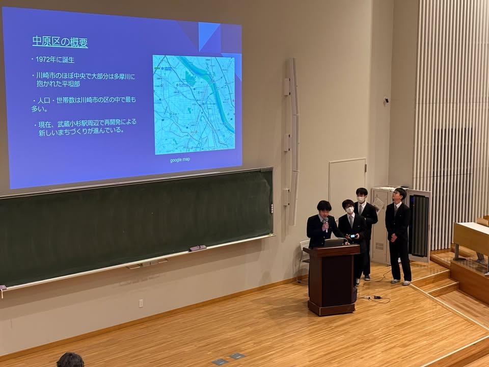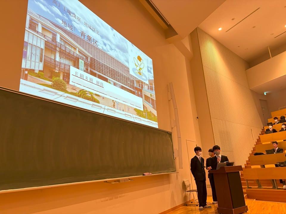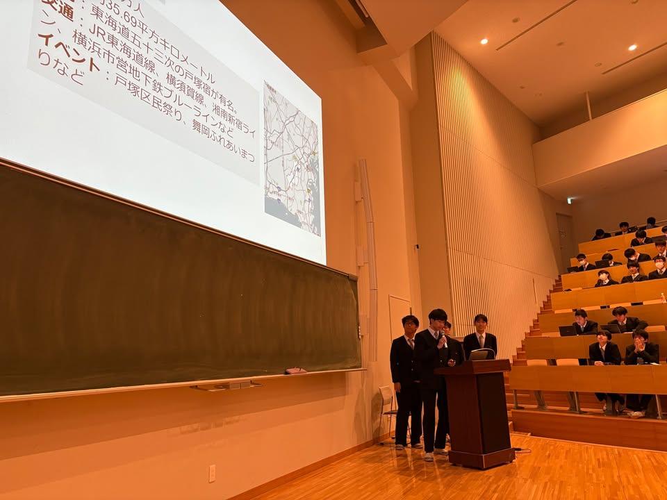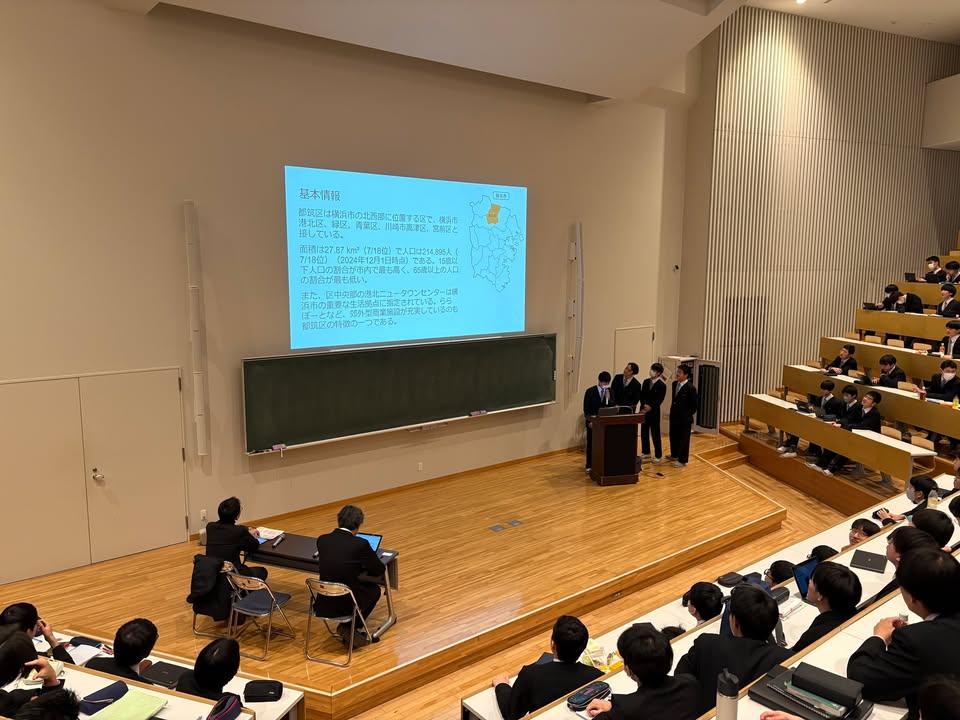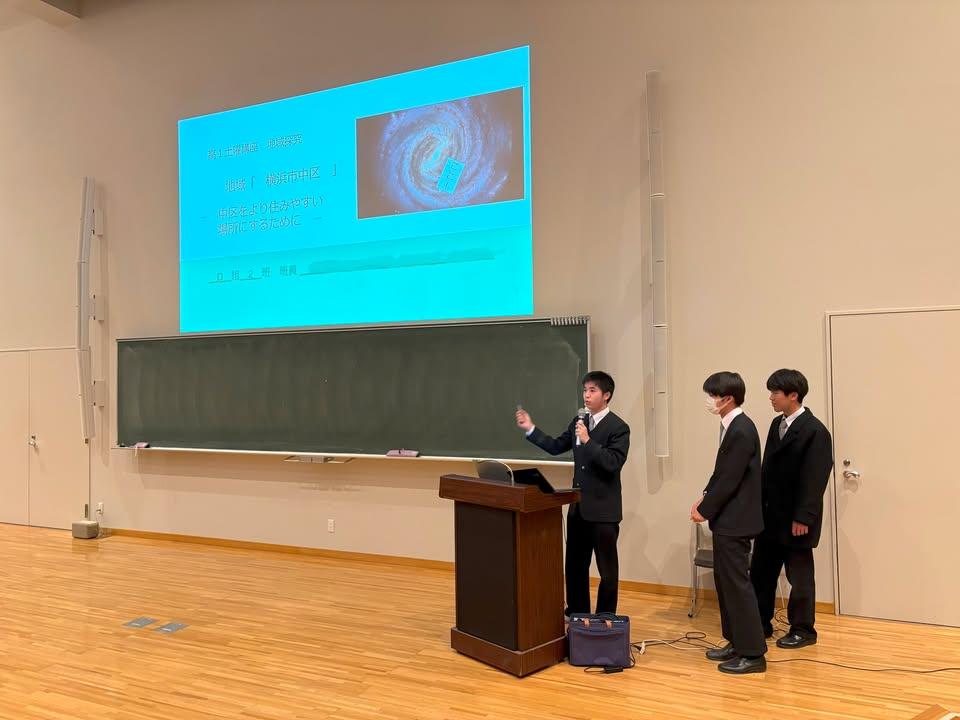 土曜講座最終回は、地域探求の成果発表でした。11月から積み重ねてきたデータ分析の学習を生かしながら、班ごとに地域の課題を発見しそれに対する対策も考察するという取り組みです。対象は横浜市内の区が中心ですが、中には川崎市や東京23区を選んだ班もあり、多くの班が現地調査も実施しました。この日は選ばれた5つの班が代表として発表をしました。e-Statなどから引き出したオープンデータを元に散布図などのグラフや分布図などの統計地図をスライドでみせながら、説明に工夫こらしていました。それぞれの班の発表後には他の生徒たちから次々と質問がとび、中にはするどい指摘もありました。33期生で横浜市都市整備局都心再生課の島田浩和課長も臨席してもらい、専門的な立場からのコメントをいただきました。お互いに探求の内容をより深めて、一年間の土曜講座が締めくくられました。