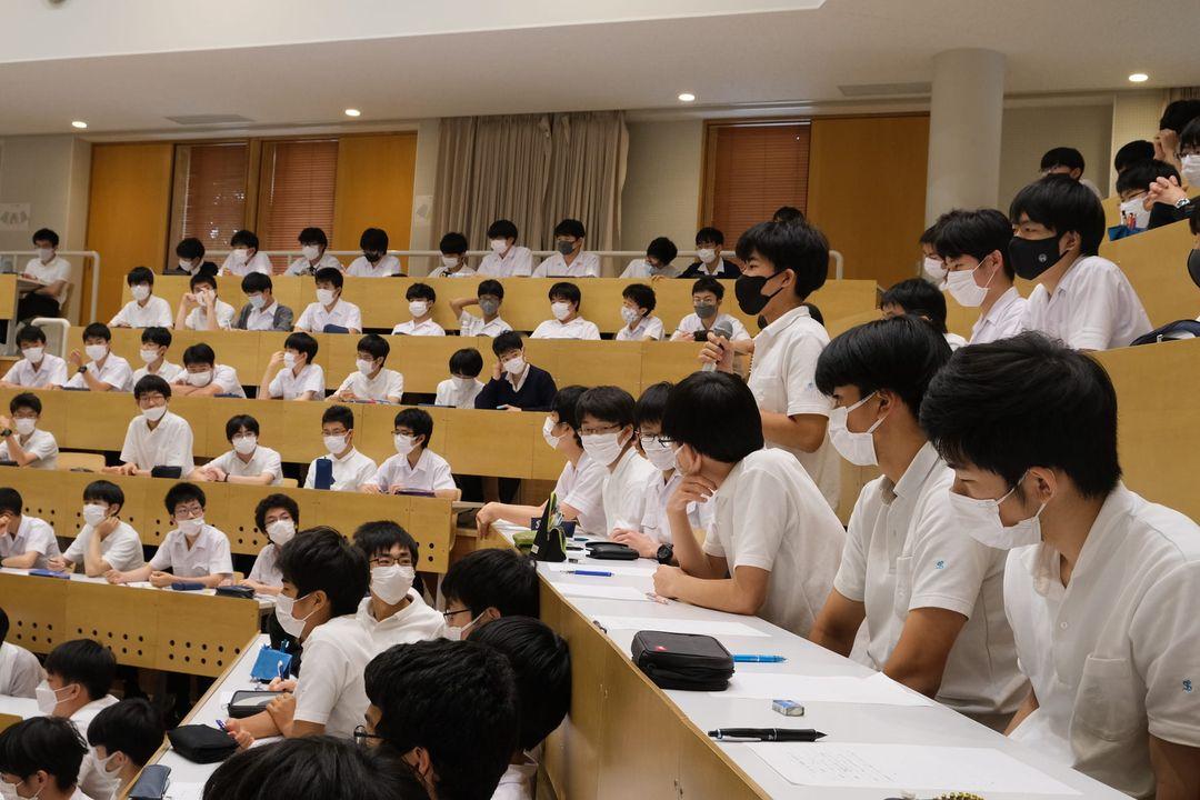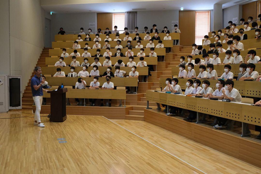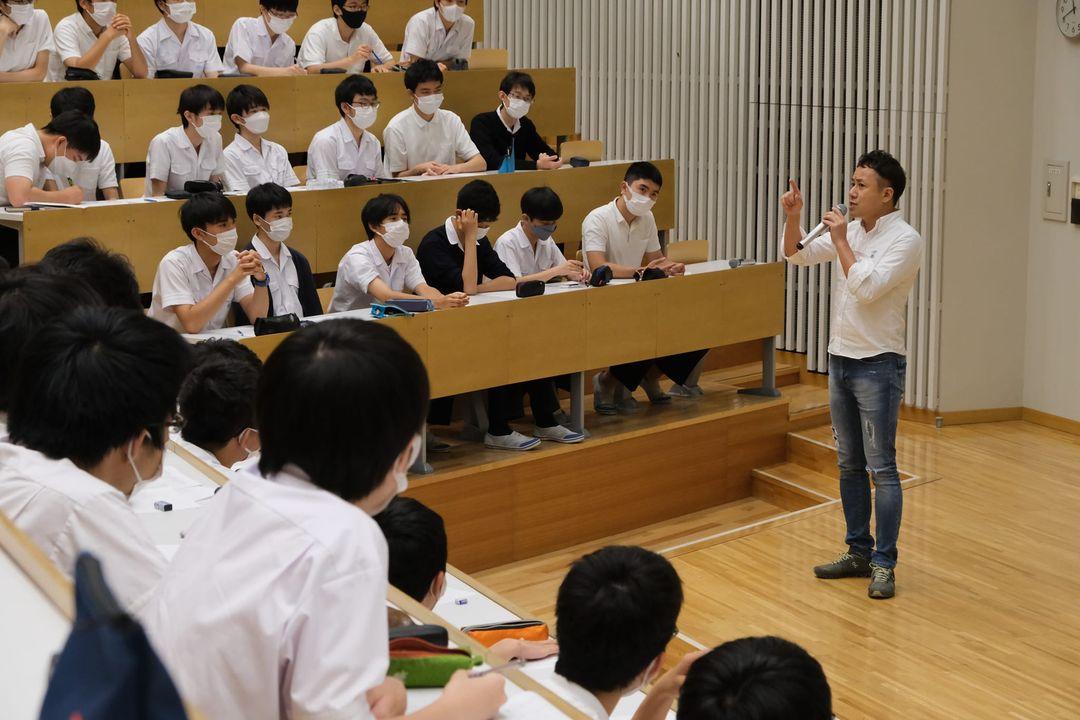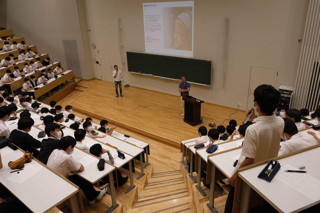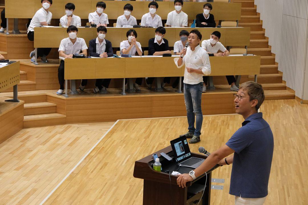 6月11日の高1土曜講座は、音楽イベントなどを開催しているNPO法人アークシップの代表理事の長谷川篤司氏とFMヨコハマ「ちょうどいいラジオ」でDJをつとめられている光邦氏による講演でした。長谷川さんの「何のために働くのか」という問いからいきなり生徒との対話でスタート。NPOの理念やイベント作りの工程の説明は、多様な働き方があることを知ったり、学園祭などの企画のヒントにつながったりしたようです。光邦さんからのDJになるまでのいきさつや朝の3時過ぎから始まるラジオ番組の準備の話などに生徒は興味津々。連発されるユーモア溢れる話に爆笑が絶えず、後悔しない人生への熱いメッセージとともにたくさんの元気をいただいたようです。アドリブで進められるお二人の絶妙の掛け合いトークに皆が魅了され、「さすが」「いつまでも聞いていたい」などの声がもれていました。