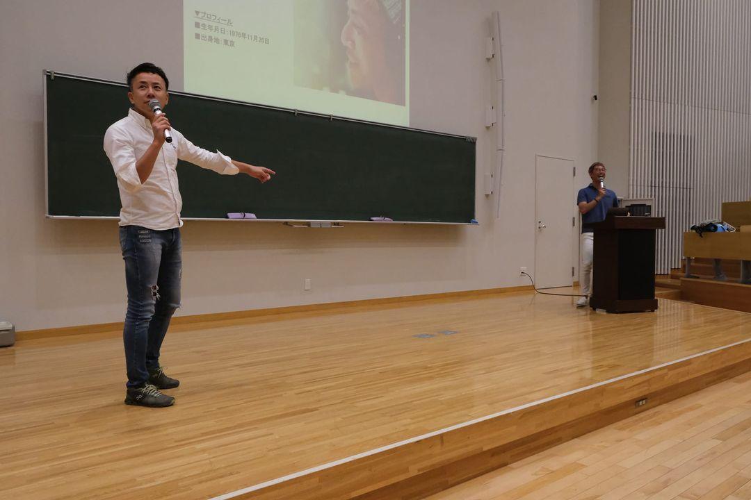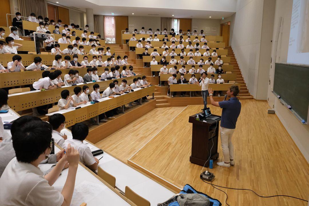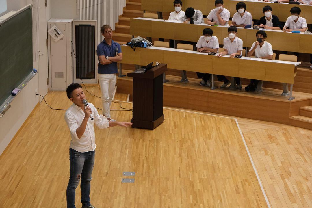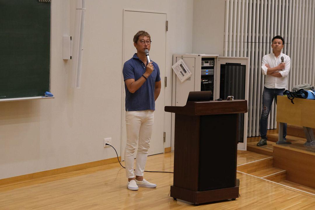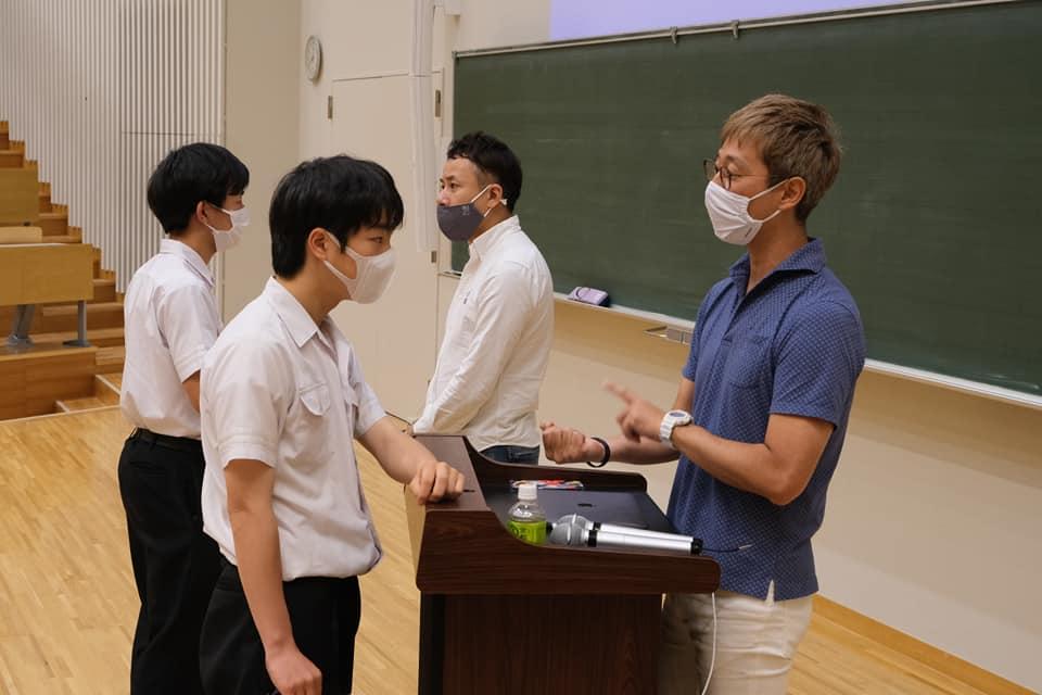 6月11日の高1土曜講座は、音楽イベントなどを開催しているNPO法人アークシップの代表理事の長谷川篤司氏とFMヨコハマ「ちょうどいいラジオ」でDJをつとめられている光邦氏による講演でした。長谷川さんの「何のために働くのか」という問いからいきなり生徒との対話でスタート。NPOの理念やイベント作りの工程の説明は、多様な働き方があることを知ったり、学園祭などの企画のヒントにつながったりしたようです。光邦さんからのDJになるまでのいきさつや朝の3時過ぎから始まるラジオ番組の準備の話などに生徒は興味津々。連発されるユーモア溢れる話に爆笑が絶えず、後悔しない人生への熱いメッセージとともにたくさんの元気をいただいたようです。アドリブで進められるお二人の絶妙の掛け合いトークに皆が魅了され、「さすが」「いつまでも聞いていたい」などの声がもれていました。