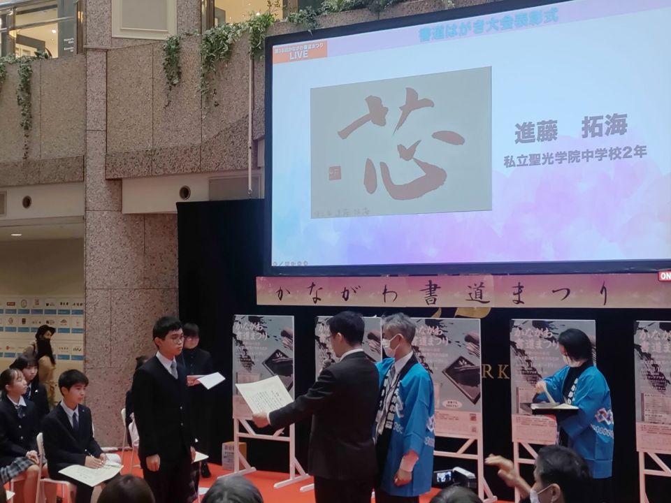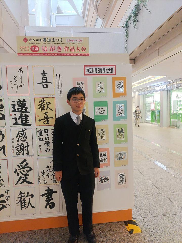 大会」において、中2進藤拓海君が「神奈川毎日新聞社大賞(中学生の部最高賞5点のうちの1点)」、中2松本健君が「特選」を受賞しました。