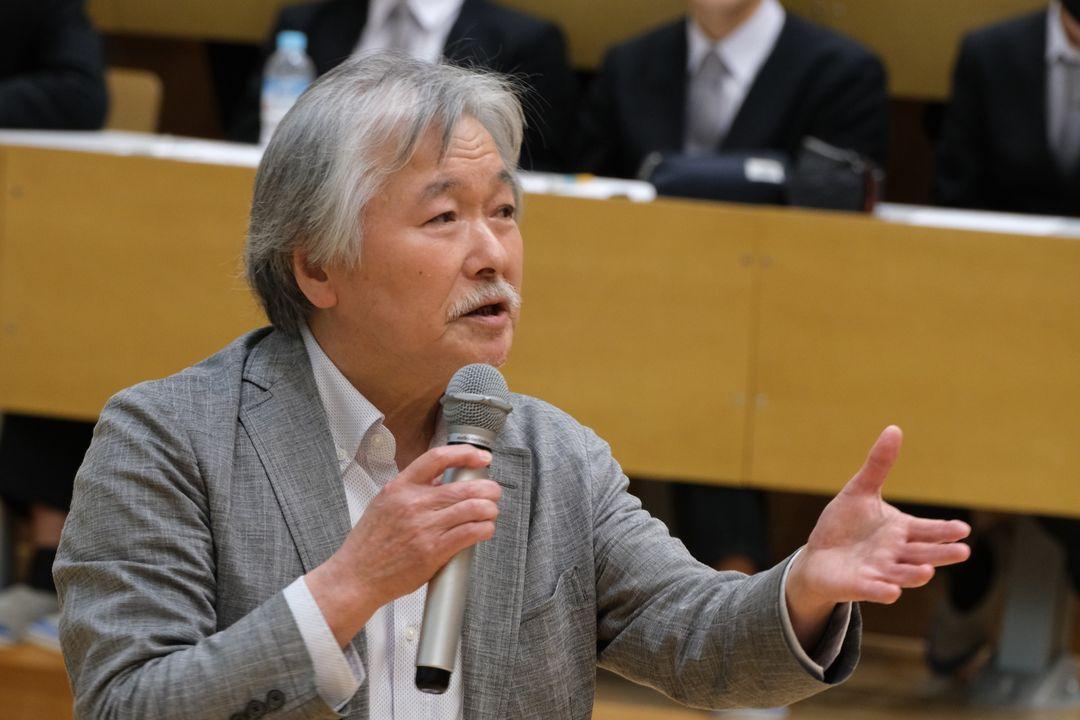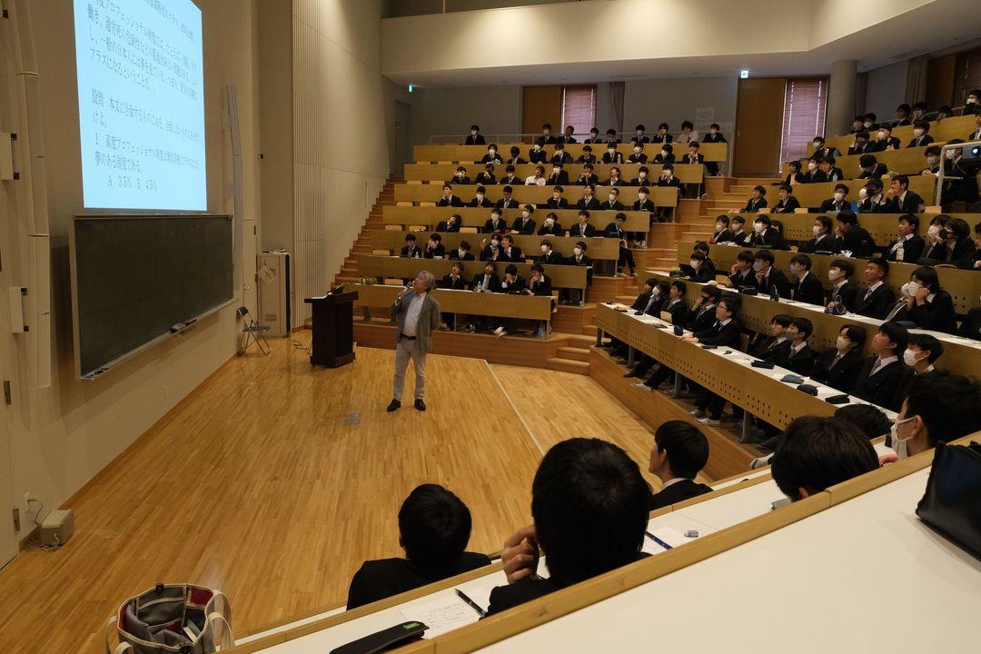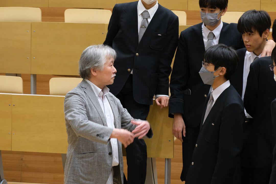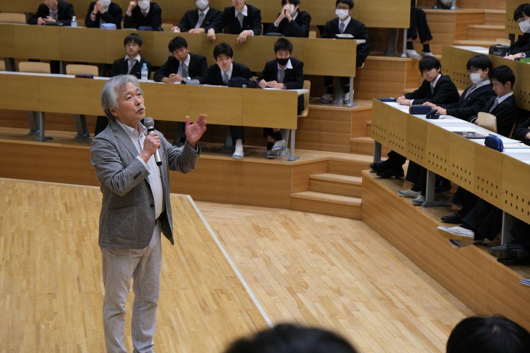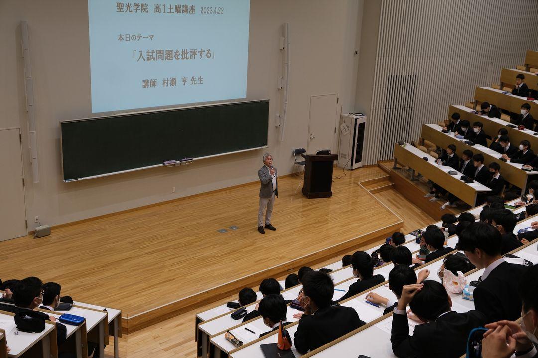 4/22の高1土曜講座の講師は、河合塾講師で『光と影 ハイデガーが君の生と死を照らす!』の著書もある村瀬亨氏でした。世界の言語についてから始まり、ユニークな大学入試問題の分析・解説、そして勉強への姿勢についてのアドバイスと話は進みます。アニメや映画の話のところでは生徒たちは身を乗り出すように聞いていました。豊富な知識をもとに縦横無尽に展開される村瀬先生の話に生徒たちは魅了され、講演後も質問する生徒たちの長い列ができました。