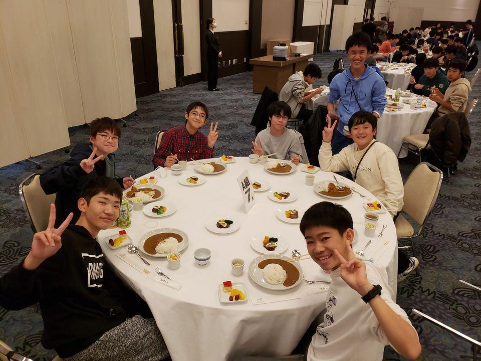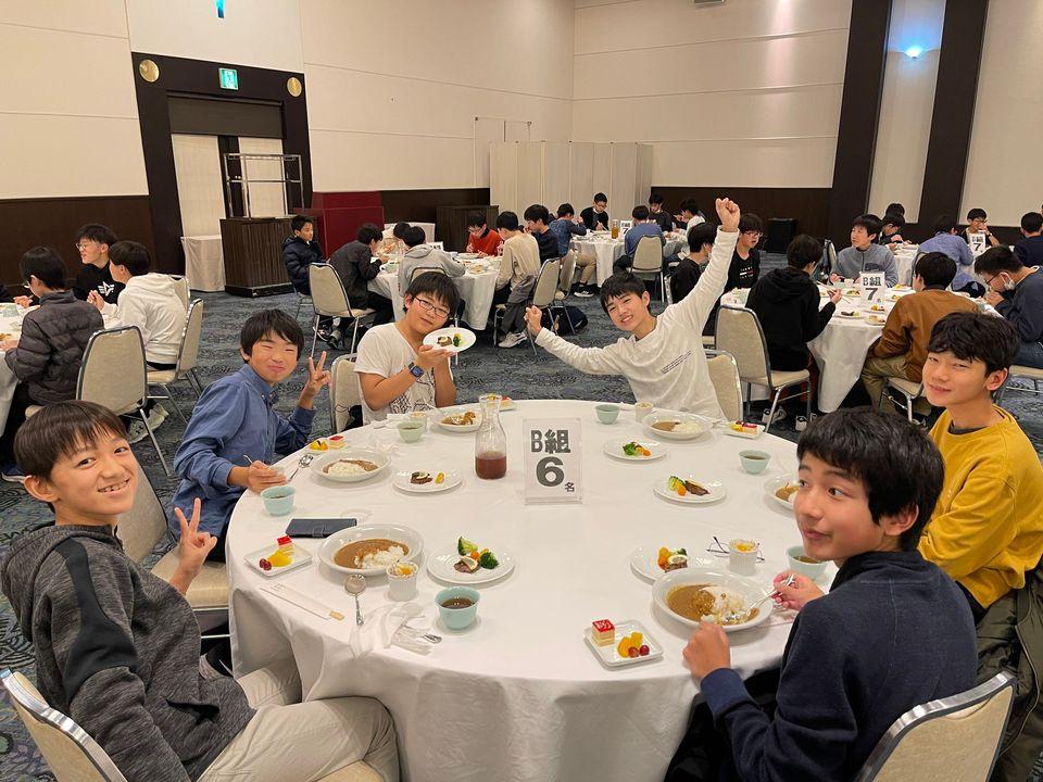 晩ご飯は広い宴会場で、美味しいハンバーグやお刺身、エビフライなどをいただき、とても満足しています。