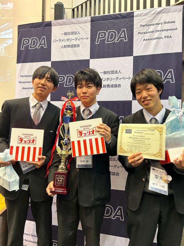 この度、63期の半田・石田・金子で12月末に開催された即興型英語ディベート全国大会に出場し、優勝することができ、夏・冬の全国大会の連覇を達成することができました。