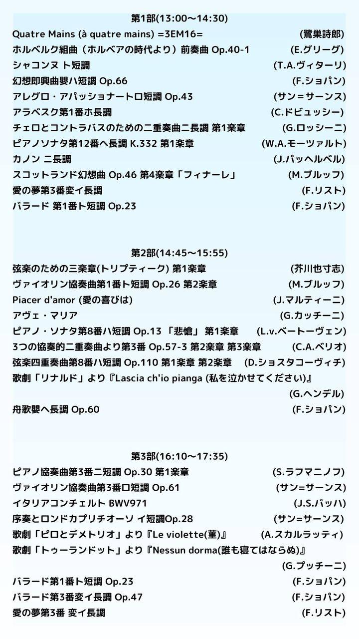 今回のコンサートは3部構成となっております。プログラムをご覧の上、ご興味のあるお時間にお越しください。