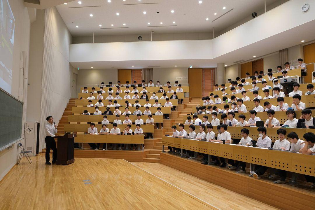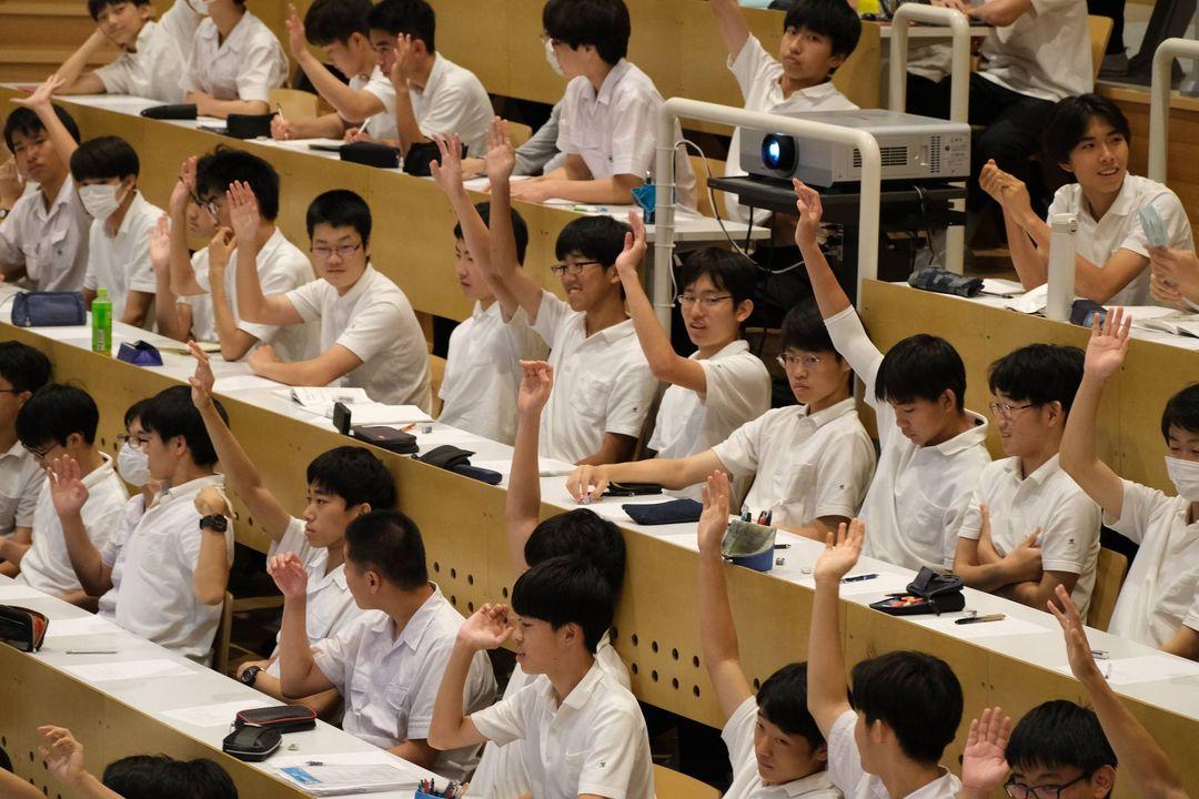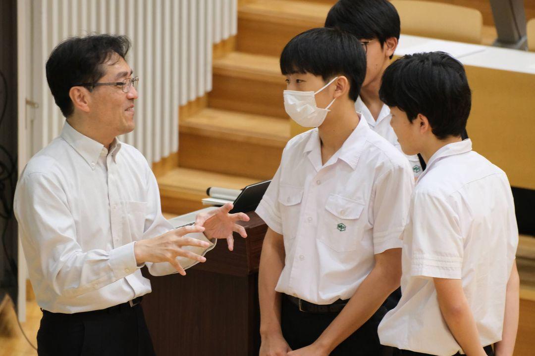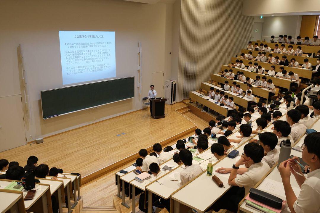 6/22の講師は、国際通貨基金(IMF)アジア太平洋地域事務所所長の吉田昭彦氏だった。前半は、まずIMFにまつわるクイズで盛り上がり会場が暖まった後にIMFの歴史・業務・組織そして国際機関としての役割などが分かりやすく説明された。多くの生徒はIMFについての知識がほとんど無い状態だったため、むしろ新鮮に受け止め関心を持って聞いていた。後半は財務省時代からの吉田氏の職歴が紹介され、最後に今後の日本を背負う生徒たちに対してたくさんのメッセージをいただいた。社会的目的を持つ重要性やコミュニケーション能力や英語力など必要とされる力の指摘は、豊富な海外でのキャリアを持つ吉田氏だからこそ、生徒たちに説得力をもって心に響いていた。